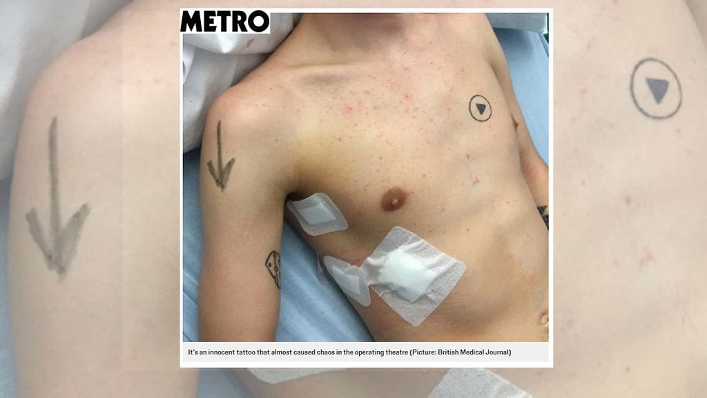 Mies oli hankkinut pienen play-nappia muistuttavan tatuoinnin rintaansa. British Medical Journalissa esitellyssä tapauksessa tatuointi melkein johti katastrofiin, kun kirurgit olettivat sen merkitsevän leikkauspaikkaa.