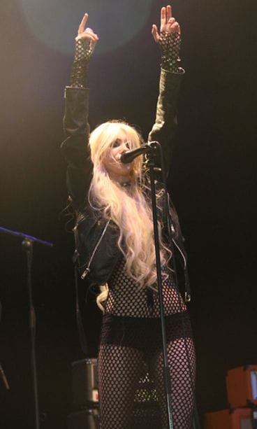 Gossip Girl -sarjan Jenny Humphrey ja The Pretty Reckless -yhtyeen laulajatar Taylor Momsen, 17, kipusi viikonloppuna lavalle Dublinissa Irlannissa. Pian 18 vuotta täyttävät teinivillikko ei jättänyt fanejaan kylmäksi, vaan esiintyi tyylilleen uskollisena paljastavassa asussa.
