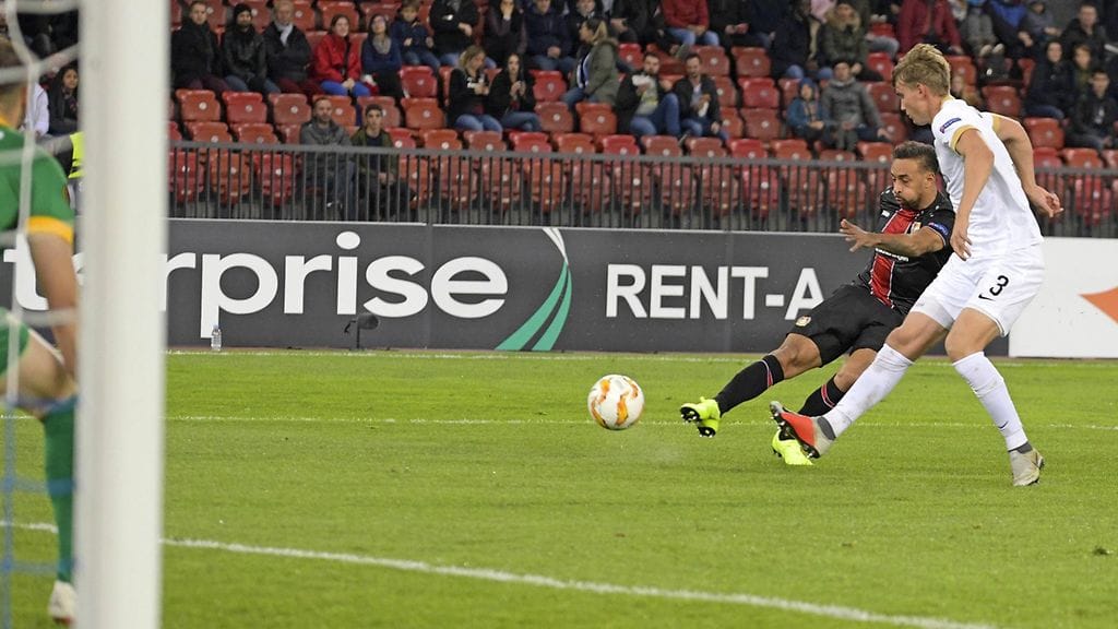 Leverkusenin Karim Bellarabi teki kaksi hämmästyttävän samanlaista maalia jalkapallon Eurooppa-liigassa torstaina.
