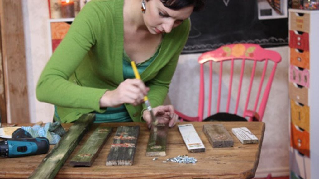 1. Koristele oksat. Liimaa ensin kiiltokuvat lautoihin ja patinoi sitten akryylimaalilla kuvien päältä ja laudan pintaa. Pyyhi hieman kostealla rätillä, jotta pinta jää epämääräisen patinoituneeksi ja epätasaiseksi. Sivele lopuksi kultamaalia pintaan.