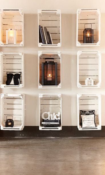 Puulaatikoista voi koota myös kätevän kirjahyllyn seinälle kiinnitysruuvien ja maalin avulla. Muista kuitenkin kiinittää huomiota siihen, minkä verran ruuvit kestävät painoa ja valitse hyllyn sisältö niiden mukaisesti.