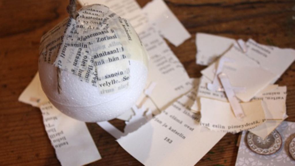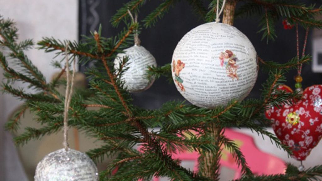 Styroksista, kirjansivuista ja kimalleliimasta saa aikaan tyylikkäitä, vähän tanskalaistyylisiä joulukuusen koristepalloja. Näillä nikseillä jokainen voi tehdä juuri omien mieltymysten mukaiset pallot kuuseen.