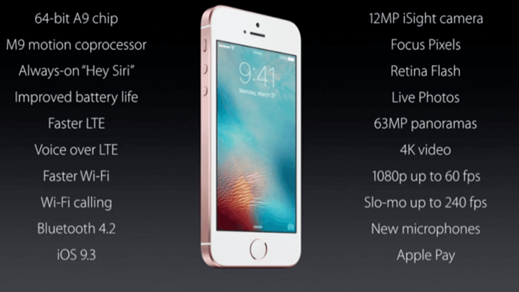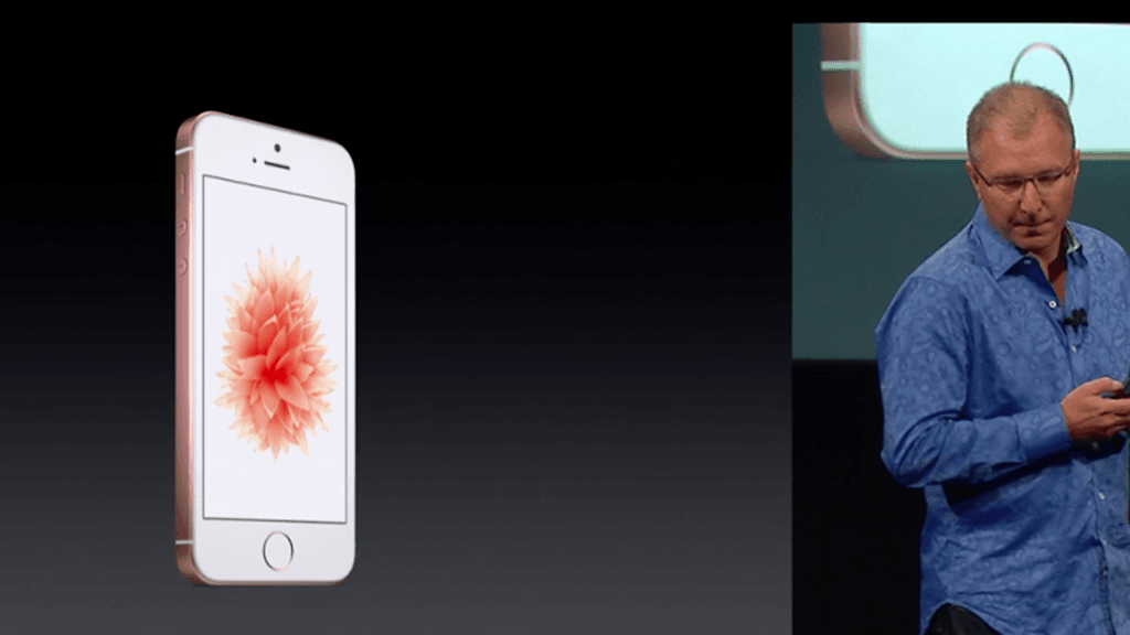 Seuraavaksi Apple esitteli uuden iPhone SE:n. Applen mukaan kyseessä on maailman tehokkain 4-tuumainen älypuhelin. Puhelimessa on yhtä paljon prosessoritehoa kuin isommassa iPhone 6S-mallissa. SE on kolme kertaa tehokkaampi kuin 5S-malli.
