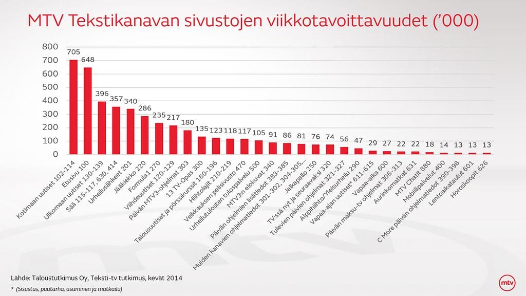 Tutkimuksen mukaan MTV Tekstikanavaa seuraa päivittäin 543 000 suomalaista ja palvelun viikkotavoittavuus on 880 000. Kolmen vuoden takaiseen tutkimukseen verrattuna päivittäisten lukijoiden määrä on vähentynyt 11 prosenttia.