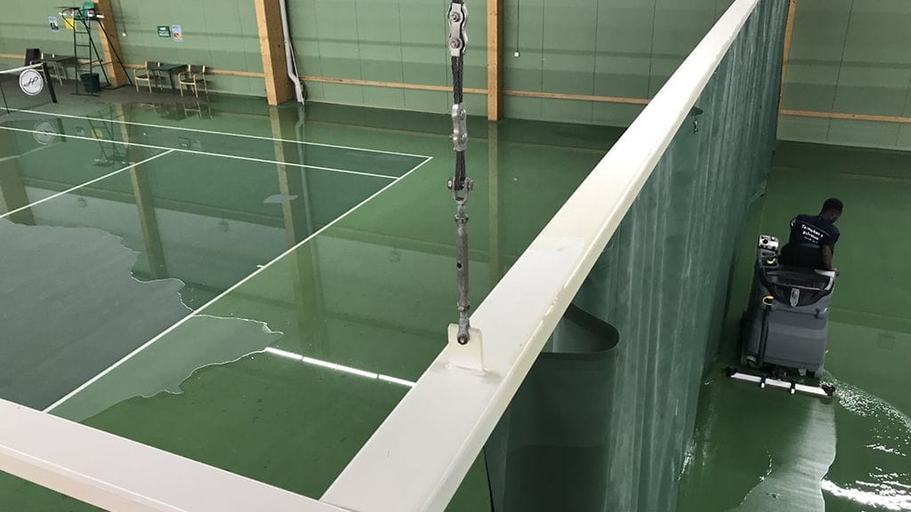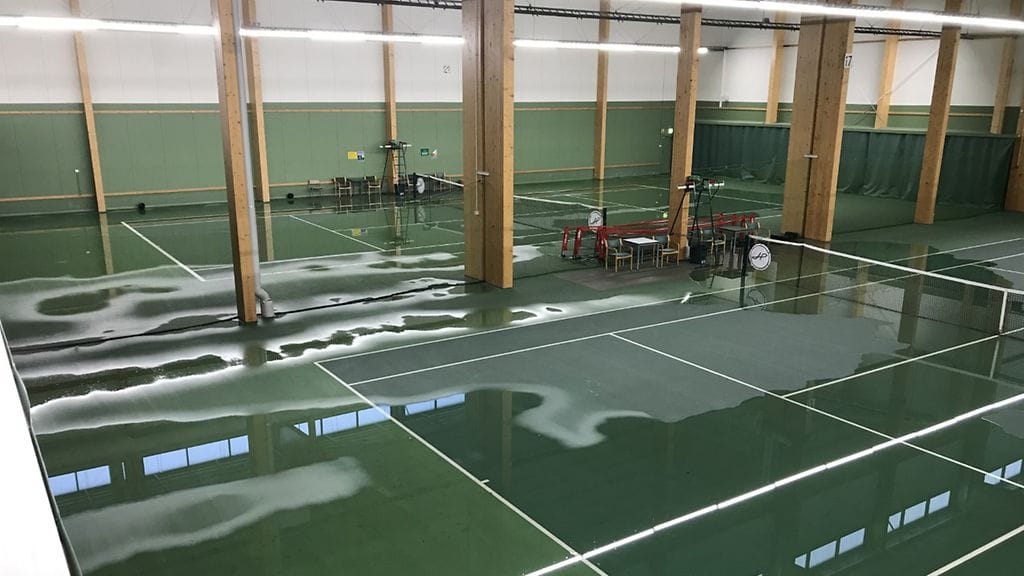 Talin tennishallin lattiat ovat lainehtineet yöllisen saderyöpyn jäljiltä. Toimitusjohtaja mukaan vedet tulvivat halliin vähintään kerran vuodessa.