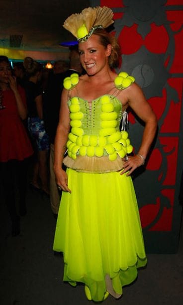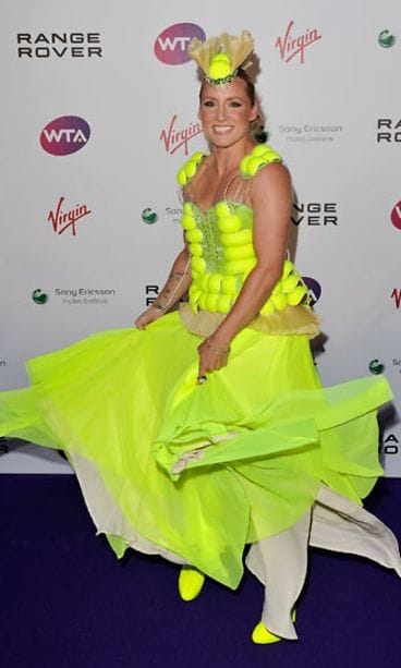 Tennispelaaja Bethanie Mattek-Sands hullutteli neonkeltaisessa tennispalloin koristellussa juhlamekossa.