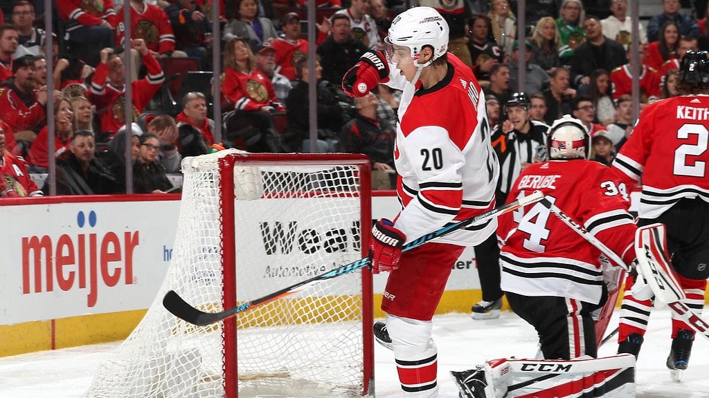 Carolina Hurricanesin Sebastian Aho viimeisteli ratkaisuosuman 3-2-lukemiin päättyneessä ottelussa Chicago Blackhawksin vieraana.
