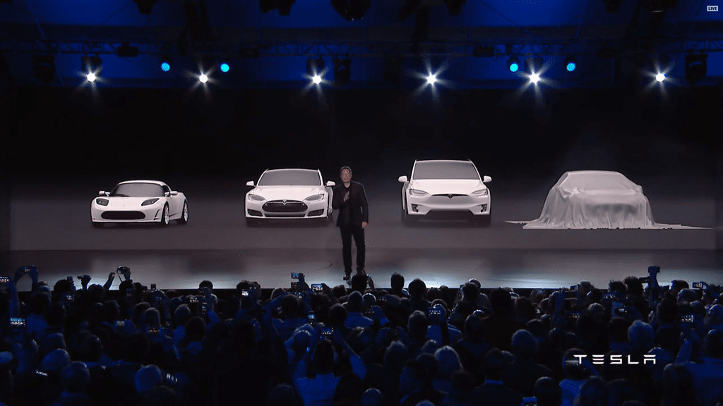 Kokonaan uuden mallin julkistustilaisuudessa Teslan perustaja ja keulakuva Elon Musk taustoitti yrityksen historiaa. Teslalla on tällä hetkellä kotimarkkinoillaan edelleen tarjolle ensimmäisenä markkinoille tullut malli, eli Lotuksen koriin tehty Tesla Roadster. Tämän jälkeen markkinoille tullut Model S on ollut myynnillisesti menestys, ja kolmantena mallina tarjolle on vastikään tullut tila-automainen Model X.