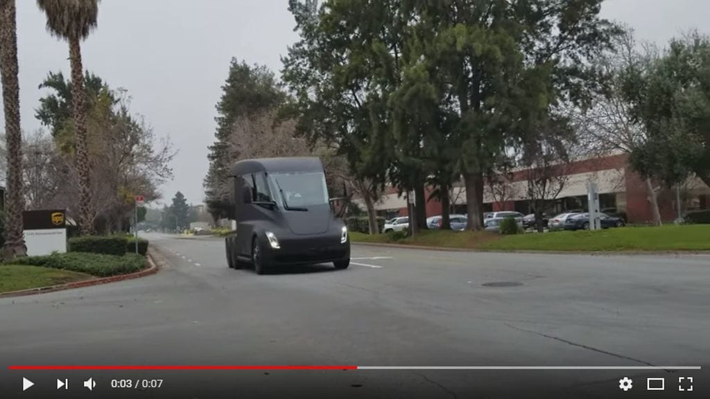 Kalifornian Santa Clarassa kuvatulla videolla nähdään mattamusta Semi, joka on tiettävästi ensimmäinen liikenteestä bongattu ja videolle päätynyt yksilö. CleanTechnica uskoo, että kyseinen Semi oli matkalla Teslan pääkonttorilta Palo Altosta sen tehtaalle Fremontiin.