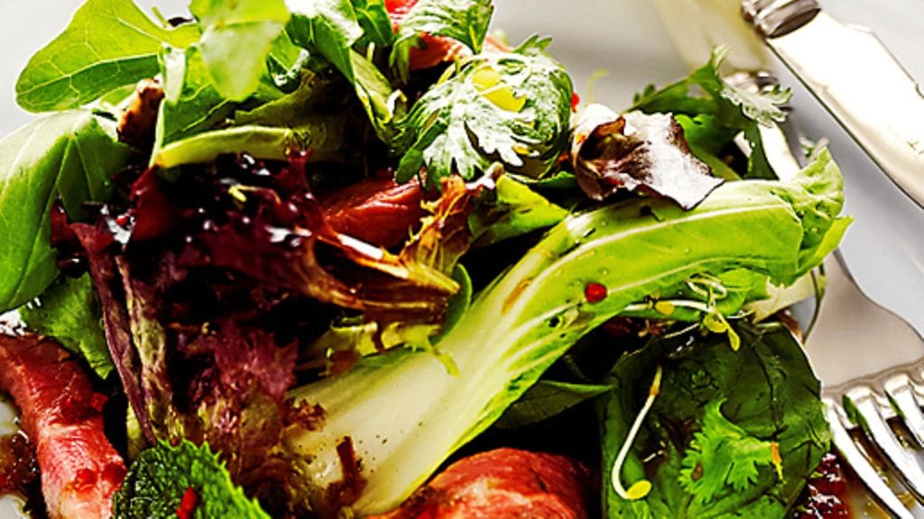 3. Revi salaatinlehdet pienemmiksi paloiksi. Asettele salaattia, pak choyta, yrttejä ja kurkkua lautasille. Viipaloi liha ohuiksi viipaleiksi ja aseta salaatin päälle. Norota päälle kastiketta, tarjoile heti.