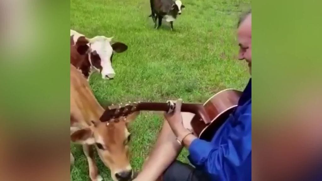 Videolta on nähtävissä, kuinka lehmät vaeltavat kuuntelemaan muusikon sulosointuja ihan viereen.