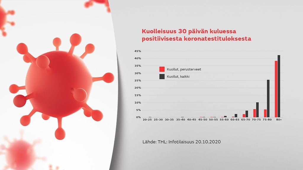 Selvityksen mukaan kuolleisuus 30 päivän kuluessa positiivisesta testituloksesta oli 75–79-vuotiailla 25 prosenttia ja yli 80-vuotiailla yli 40 prosenttia. THL:n aineistossa joka neljäs 75–79-vuotiaista ja lähes puolet yli 80-vuotiasta tartunnan saaneista siis kuoli koronavirukseen.