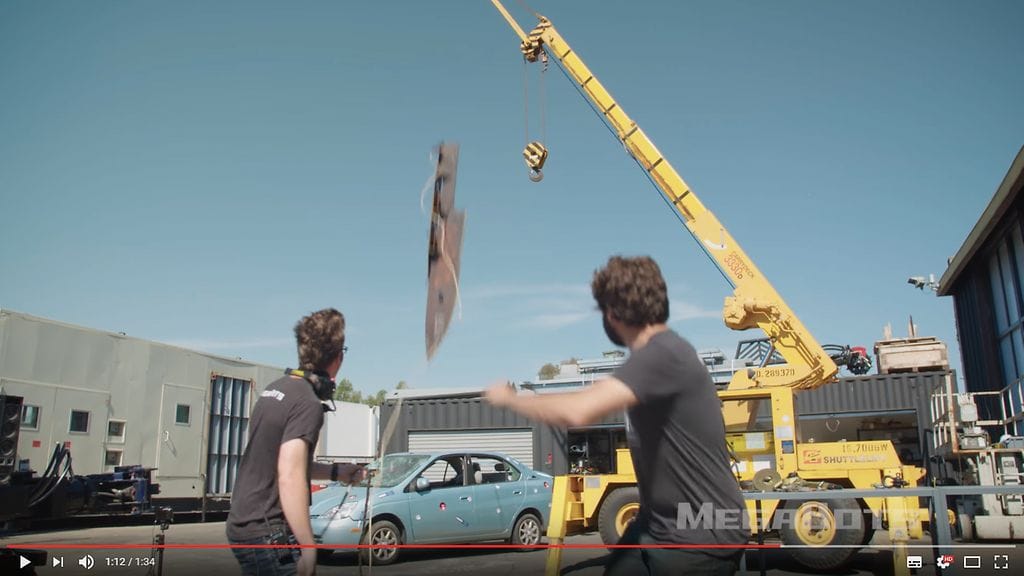 MegaBots Inc testaa YouTube-kanavallaan julkaisemassa videossaan, mitä käy Toyotan Prius-hybridille, kun sen päälle pudotetaan nosturista 200 kiloa painava veitsi.