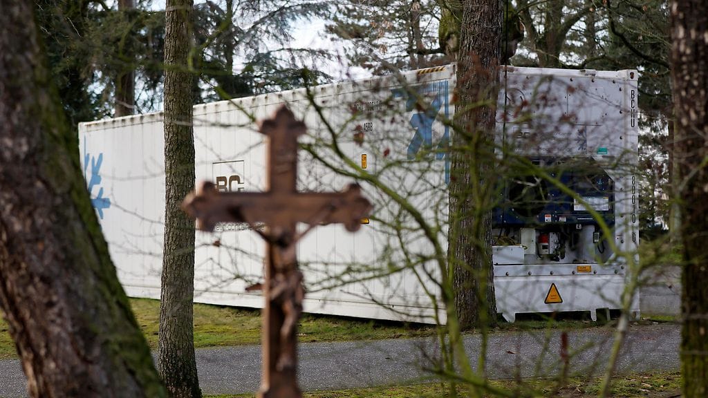 Niin tai näin, nyt Schaldachin krematorio pullistelee ruumisarkkuja. Normaalisti muistotilaisuuksille varatusta salista on tullut tilapäinen ruumishuone. Melko karun näköisiä puuarkkuja on kasattu jopa kolmeen kerrokseen päällekkäin, osa on pitkin käytäviä.