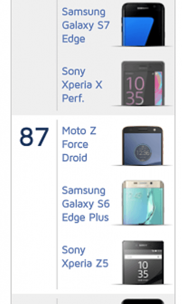 Pixel saa DxOMarkilta 89 pistettä, kun aiempaan huipputulokseen 88 on yltänyt ohessanäkyvät kolme puhelinta. Applen uusi iPhone 7 ylsi juuri vain 86 pisteeseen.