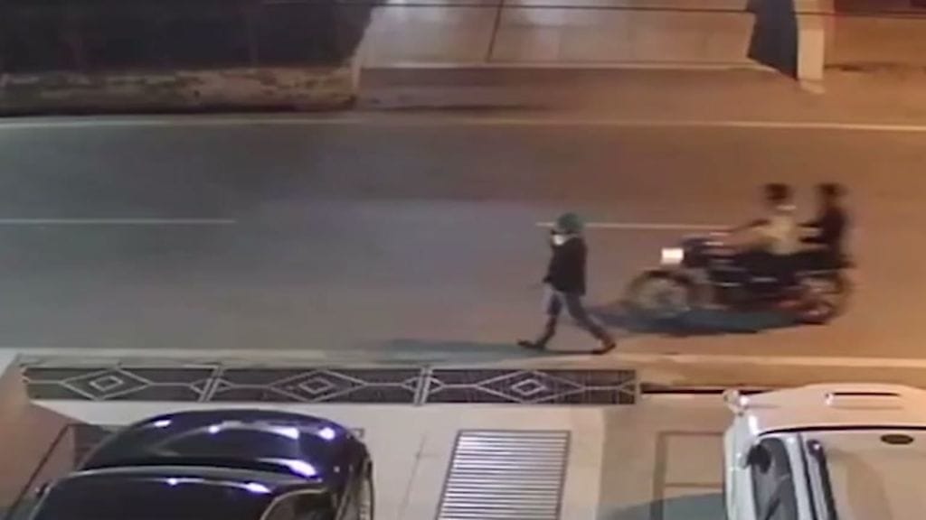 Videolla nainen kävelee autotien laidassa ja puhuu puhelimessa. Pian hänen takaansa saapuu kaksikko moottoripyörällä.