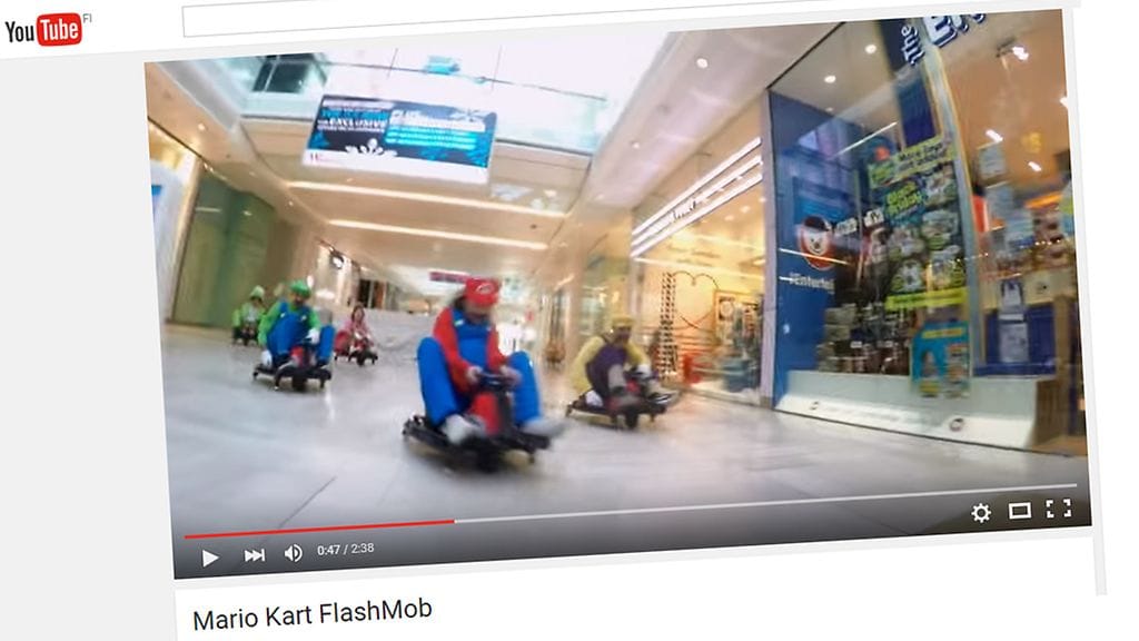 Westfieldin ostoskeskuksessa Lontoossa nähtiin helmikuun alussa astetta erikoisempi flashmob-esitys. Mario Kart -pelisarjasta tutut hahmot valtasivat ostarin käytävät kisailumielessä – ainoana sääntönään, että kiinni ei saanut jäädä.