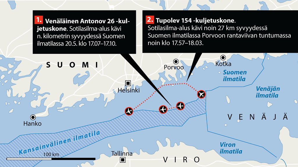 -Toukokuun 20. päivän ilmatilaloukkauksista ensimmäinen tapahtui kello 17.07-17.10. Venäläinen sotilaskuljetuskone Antonov AN-26 kävi syvimmillään noin kilometrin verran Suomen ilmatilassa Suomenlahdella.-Toinen loukkaus tapahtui kello 17.57-18.03. Tällä kertaa vuorossa oli venäläinen sotilaskuljetuskone Tupolev TU-154. Se kävi 27 kilometrin syvyydessä Suomen ilmatilassa ja ehätti Porvoon rantaviivan tuntumaan.