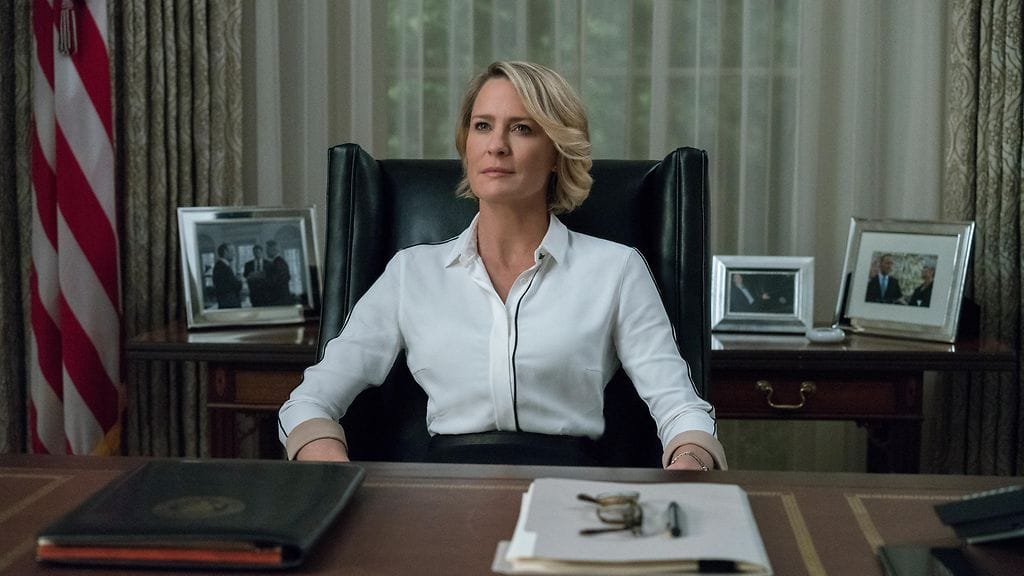 Itkukohtaus kääntyy kuitenkin trailerissa päälaelleen, kun Wrightin hahmo lopettaa kyynelehtimisen ja katsoo tuimana kameraan, kuten Spaceyn hahmo useaan otteeseen sarjan aikana. Sarjan viides kausi päättyi, kun Spaceyn hahmo jätti presidentin viran ja Wright nousi valtaan. Viimeisessä jaksossa nähtiin ensimmäinen kerta, kun Wright rikkoi neljättä seinää Spaceyn tapaan.
