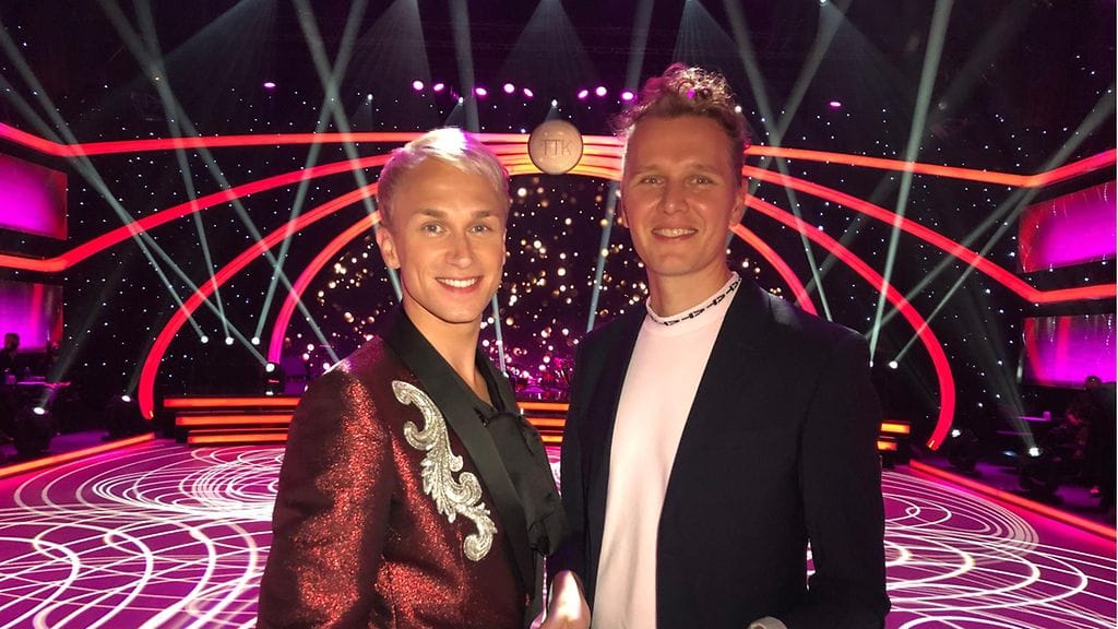 Tanssikilpailun vuoden 2019 voittaja Christoffer Strandberg saapui Tanssii Tähtien Kanssa -yleisöön yhdessä miehensä Janne Strandbergin kanssa. Tanssiopettaja Jutta Heleniuksen parina viime kaudella hurmannut näyttelijä kannustaa entistä tähtiopettajaansa.
