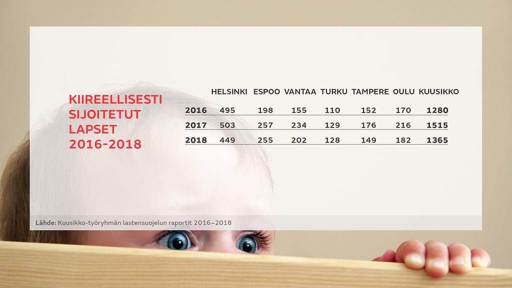 Vuonna 2016 Suomen kuudessa suurimmassa kaupungissa Helsingissä, Espoossa, Vantaalla, Turussa, Tampereella ja Oulussa sijoitettiin kiireellisesti kodin ulkopuolelle yhteensä 1 280 lasta, mikä oli 75 enemmän kuin edeltävänä vuonna.