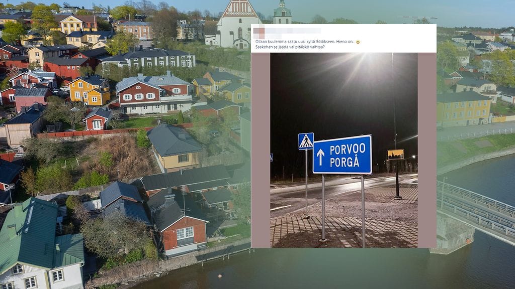 Porvooseen ohjaavan tienviitan suomenkielinen nimi on kirjoitettu oikein, mutta ruotsinkielinen nimi on kirjoitettu Porgå, vaikka Porvoon ruotsinkielinen nimi on Borgå.