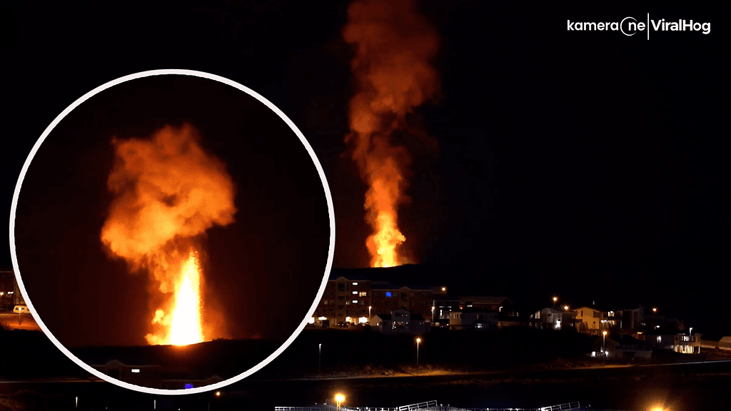 Islannissa taltioitiin kameralle epätavallinen näky, kun Reykjanesin niemimaan tulivuoresta räjähti laavapurkaus 300 metrin korkeuksiin.