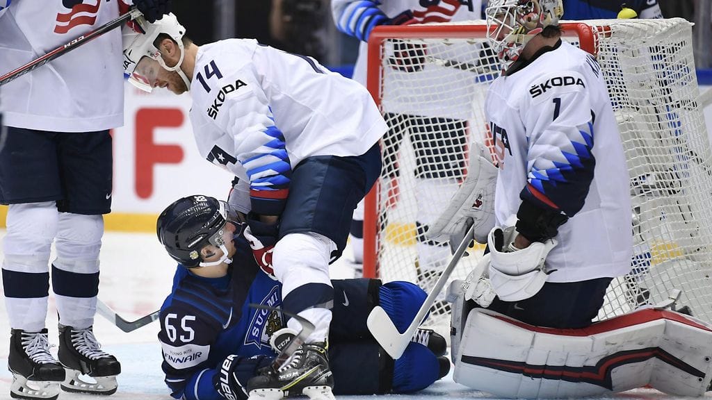 Kasperi Kapanen sai USA:n Patrick Kanen järkkymään karvaamalla häneltä kiekon Suomen alueella vahvalla mailahäirinnällä.