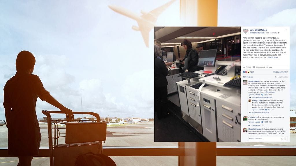 Naisen koskettava teko lentokentällä ei jäänyt sivullisilta huomaamatta. Nyt tarina leviää myös sosiaalisessa mediassa.