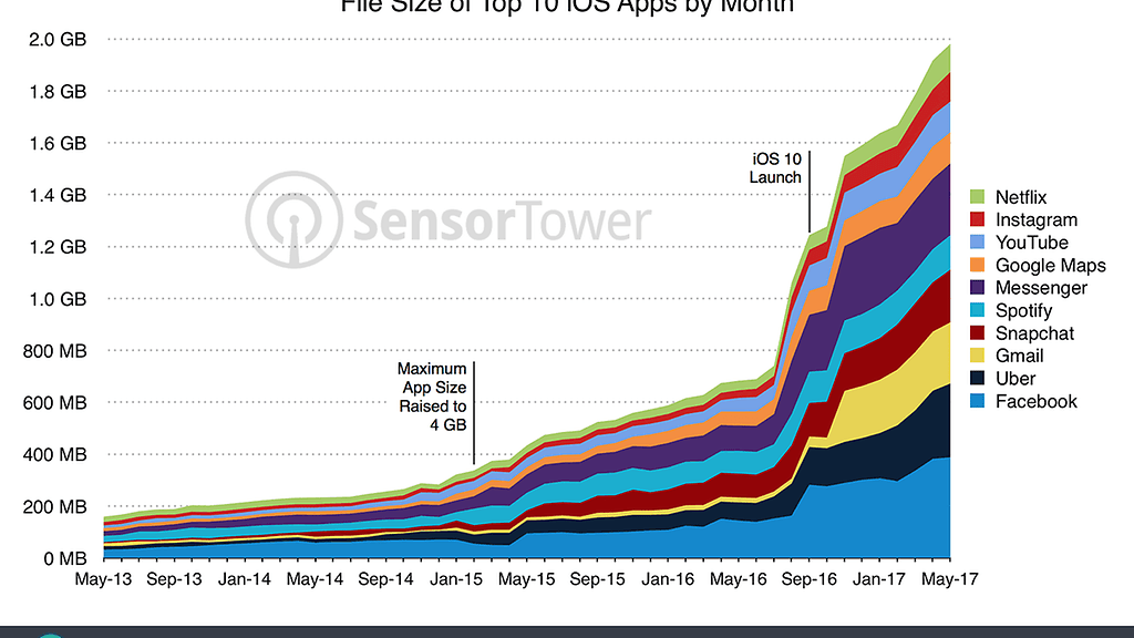 Sovellusten koon kiihtyvään kasvuun on voinut vaikuttaa myös Applen päätös tuplata uusien iPhone-mallien tallennusmuistikapasiteetit. Suuri sovellusten tiedostokoon kasvu ajoittuu myös Applen uuden iOS 10 -ohjelmiston julkaisun yhteyteen, mutta Sensor Tower ei iOS 10:tä kuitenkaan näe merkittäväksi tekijäksi sovellusten koon kasvussa. Sen sijaan samanaikaisesti viime syksystä alkaen esimerkiksi Facebookin sovellukset alkoivat saada huomattavasti uusia, monesti Snapchatista kopioituja toimintoja, jotka kasvattivat myös sovellusten kokoa entisestään.