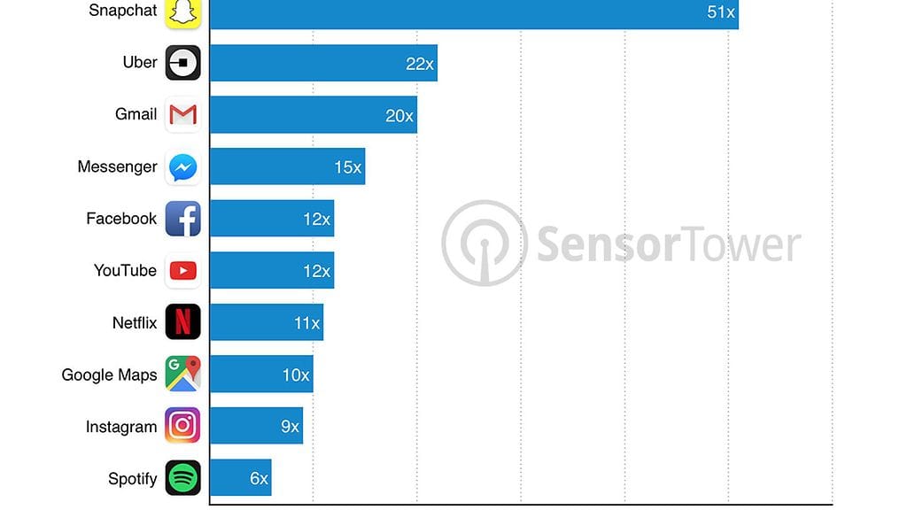 Eniten tarkasteluvälillä kasvoi Snapchat-sovelluksen tiedostokoko, jopa 51-kertaiseksi. Vielä vuonna 2013 Snapchatin koko oli vain 4 megatavua, josta se on noussut yli 203 megatavuun. Suurin TOP10-sovellus on kuitenkin Facebook, jonka koko on paisunut 32 megatavusta jo 388 megatavuun.