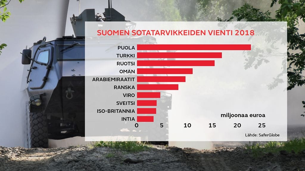 Puolaan Suomi on vienyt sotilastarvikkeita viime vuonna lähes 23 miljoonalla eurolla, toiseksi suurimpaan vientimaa Turkkiin 17 miljoonalla. Ruotsiin tarvikkeita vietiin 15,6 miljoonalla ja Omaniin 11 miljoonalla eurolla. Arabiemiraatteihin vientiä oli 9,7 miljoonalla eurolla.