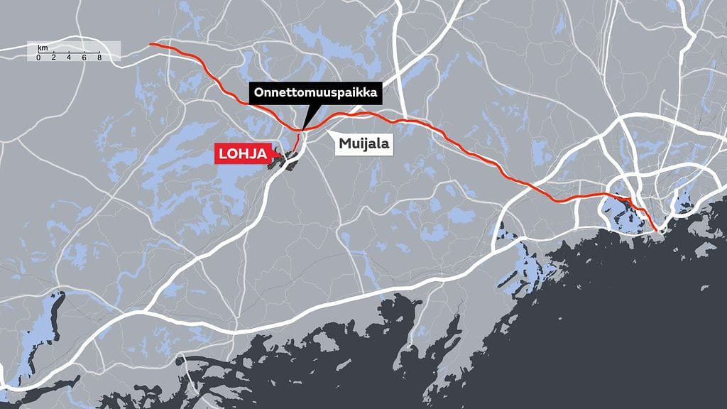 Suurin onnettomuus tapahtui Turun moottoritiellä Lohjalla. Moottoritiellä sattui iltapäiväviiden jälkeen kaksi erillistä onnettomuutta. Ensimmäisessä oli mukana kaksi rekkaa ja kymmenen henkilöautoa. Toisessa turmassa oli mukana viisi henkilöautoa.