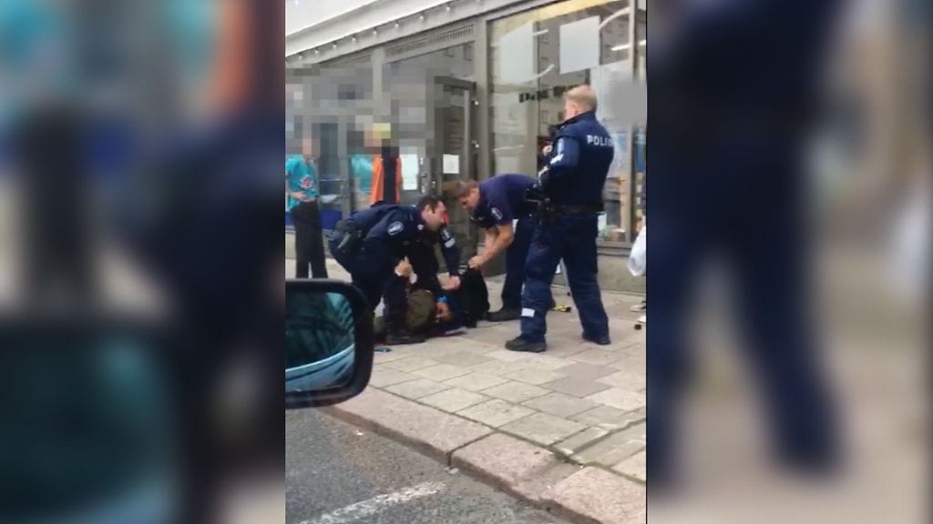 Kadun varteen pysäköidyt autot estivät hetkeksi näkymän puukottajaan ja uhriin, mutta kun poliisiauto pysähtyi ja poliisit astuivat ulos, he näkivät taas miehen seisovan ja pitävän uhristaan kiinni, puukko tämän kaulalla.