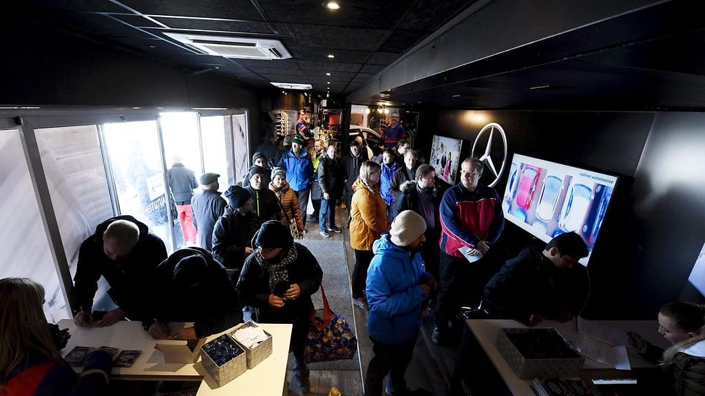 Jatkuva virta ihmisiä jonotti heti aamulla juttusille Uudenkaupungin autotehtaan rekrytointirekkaan Turun torilla.