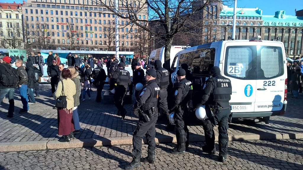 Mellakkavarusteiset poliisit eristivät torin pohjoispään mielenosoittajat visusti torin eteläpäässä järjestetystä turvapaikanhakijoiden tukikonsertista.