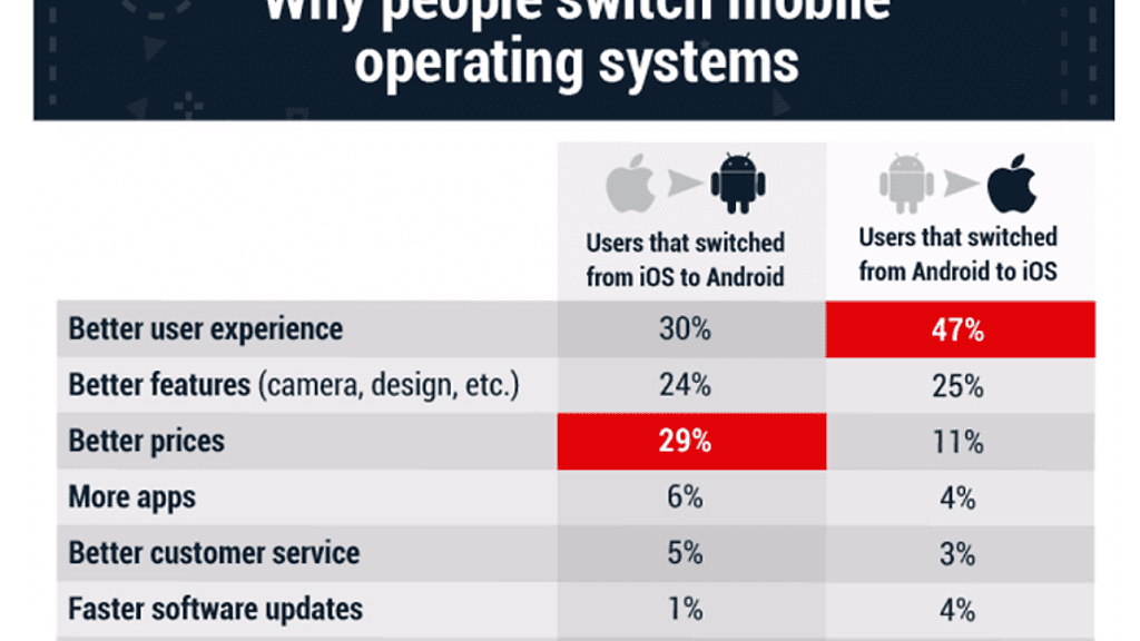 Kyselytutkimukseen osallistuneista 18 prosenttia päätyi vaihtamaan Androidista iOS:n puolelle 11 prosentin tehdessä päinvastoin. Näin ollen, mukavat 71 prosenttia oli pysytellyt saman ekosysteemin kelkassa jo vuosia, joten lojaalius näyttää siltä osin olevan älypuhelinkäyttäjillä yleistä. Käyttäjät vaikuttavat tykästyneen tuttuun toimintamalliin, eikä uuden opettelu mahdollisine ongelmineen näytä houkuttavan.