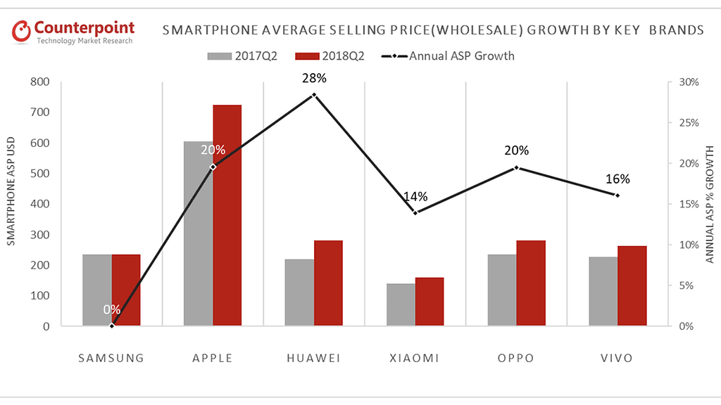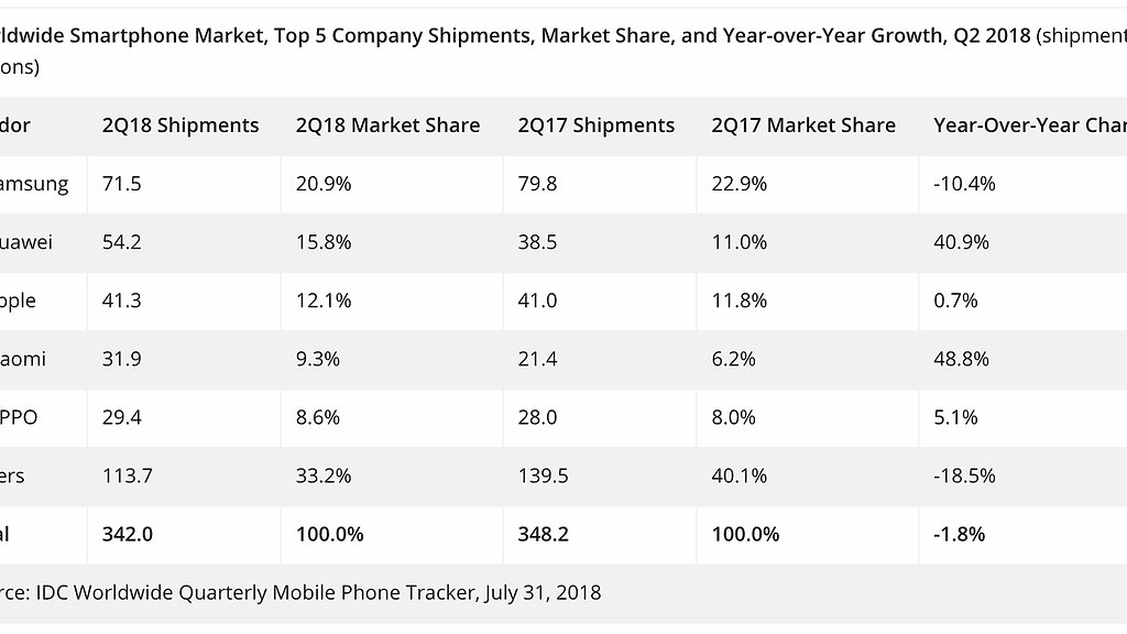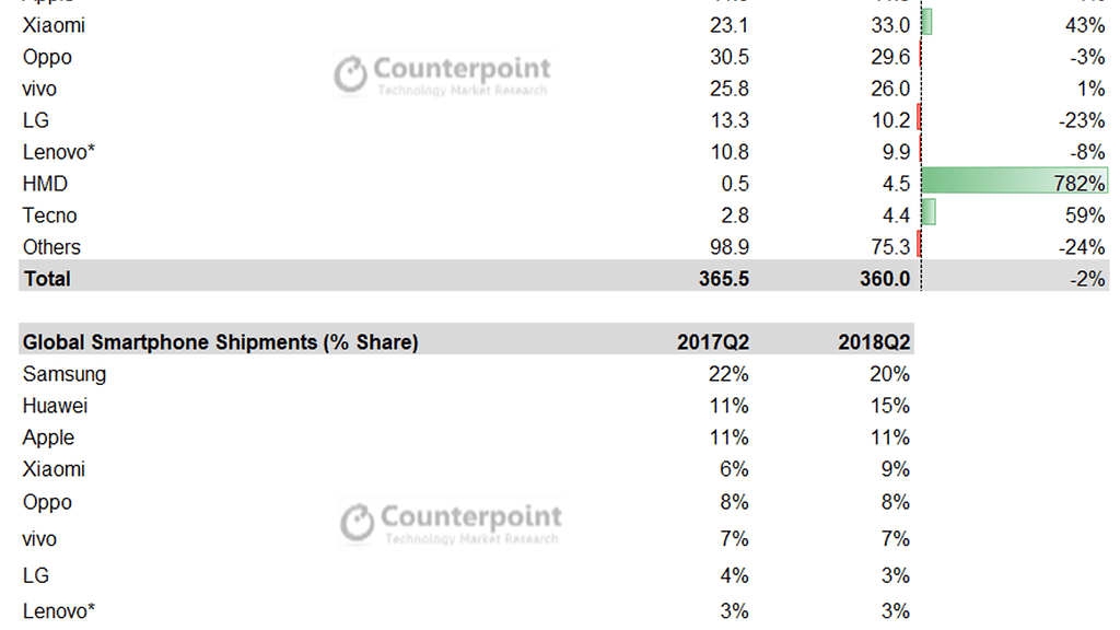 Johtuen eroista kokonaismarkkinan arvioidussa koossa, eri tutkimusyhtiöiden luvuissa markkinaosuudet ovat myös hieman erilaisia. Tutkimusyhtiö IDC arvioi koko maailman älypuhelintoimituksiksi huhti-kesäkuussa 342 miljoonaa älypuhelinta, mikä tarkoitti Huaweille 15,8 prosentin markkinaosuutta, Counterpoint Research puolestaan 360 miljoonaa älypuhelinta, jolla Huawein osuus jää tasan 15,0 prosenttiin.