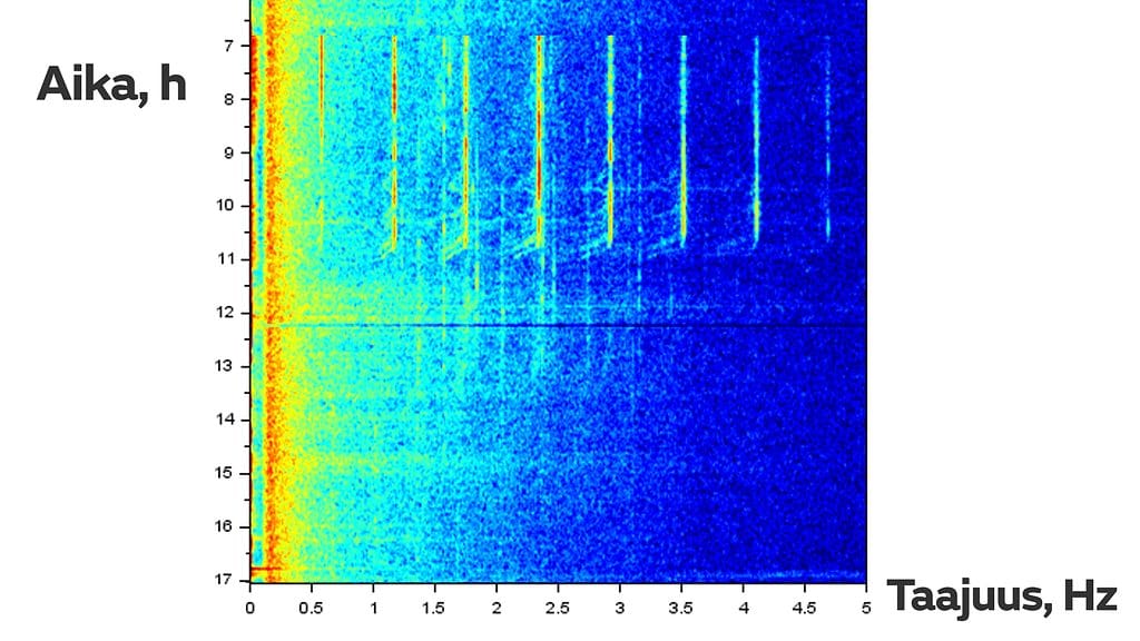 – Mittauskuvista näkyy selkeästi tuulivoimaloiden tuottama jatkuva infraääni, sillä spektrogrammeissa näkyvät spektripiikit häviävät, kun voimalat pysäytetään. Olemme havainneet, että infraääni peittyy osittain kohinaan kovan maatuulen aikana, kertoo Aunio.
