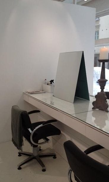 ” Nina halusi, että kampaamo olisi mahdollisimman epäkampaamomainen ja tila muunneltavissa. Niinpä esimerkiksi peilit seisovat pöydällä ja ne on helppo tarvittaessa nostaa syrjään. Näin pöytäala jää vapaaksi vaikkapa sushin valmistamiseen tai tanssimiseen, mitä nyt milloinkin haluaa tehdä.”