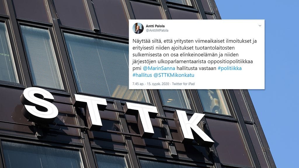 Työntekijäjärjestö STTK:n puheenjohtaja Antti Palola syyttää tviitissään tuotantolaitoksiaan sulkeneita yrityksiä "ulkoparlamentaarisesta oppositiopolitiikasta Sanna Marinin hallitusta vastaan".