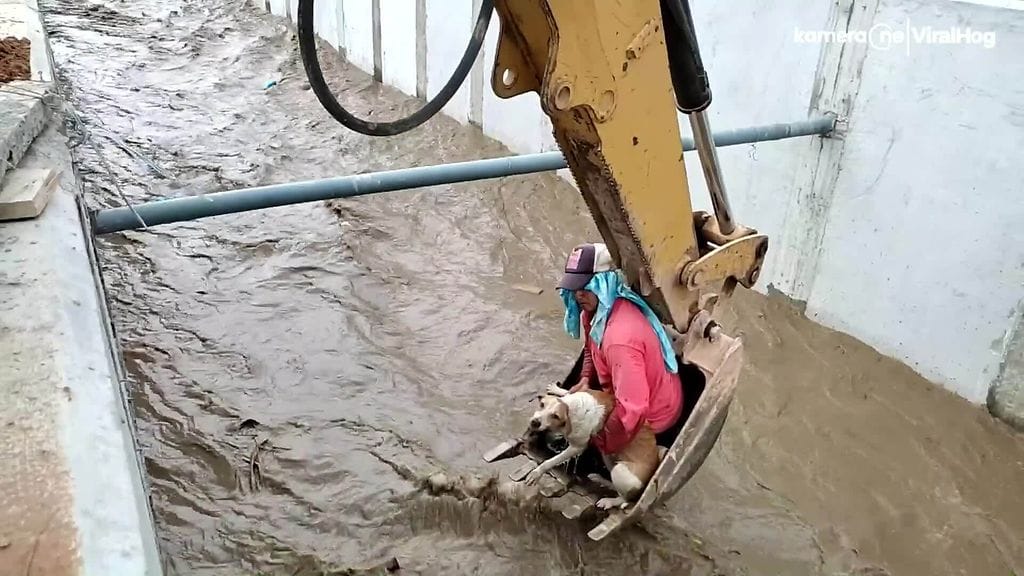 Videolla näkyy, kuinka yksi työmies hyppää päättäväisesti kaivurin kauhan kyytiin. Parin metrin verran alaspäin juuri ajallaan lasketusta kauhasta hän sai kovalla työllä nostettua hädässä olleen koiran kyytiinsä.