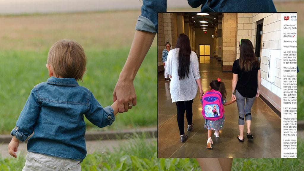 Hänen jakamassaan kuvassa hänen ja ex-miehen tytär kulkee reppu selässään äitiensä välissä.