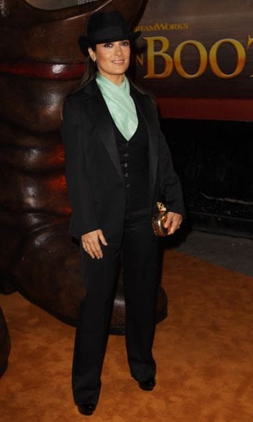 Näyttelijä Salma Hayek, 45, on luonnonkaunis nainen kadehdittavan upeine kurveineen. Tähti piti kuitenkin eilen kurvinsa piilossa Saapasjalkakissan Lontoon ensi-illassa, sillä hän oli pukeutunut varsin maskuliiniseen tyyliin.