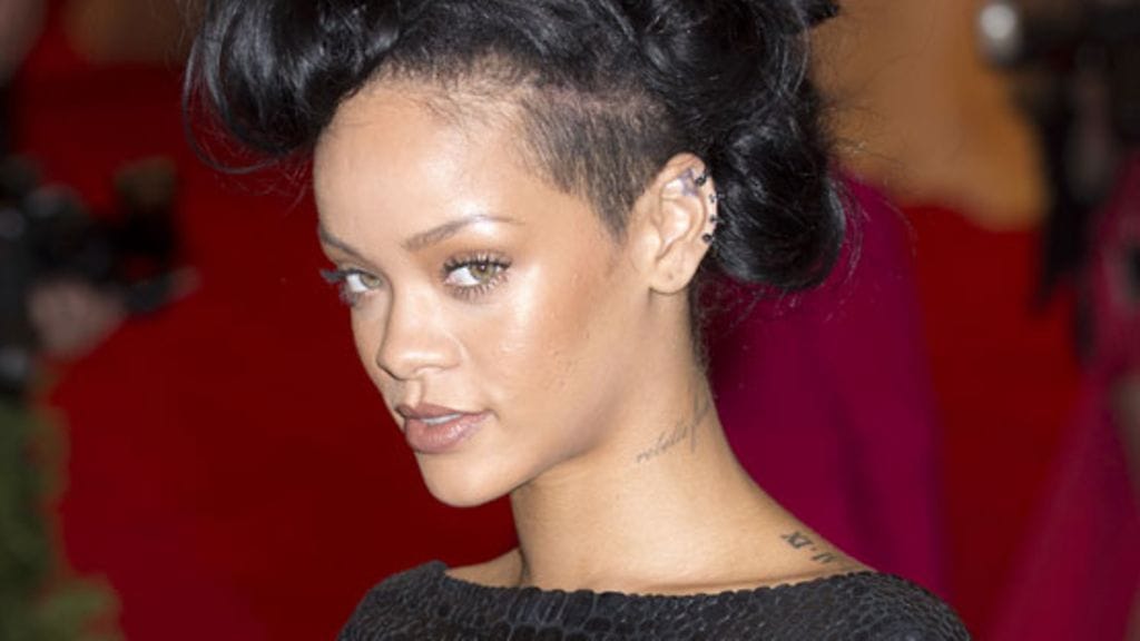 Rihanna oli valinnut ylleen Tom Fordin valoa taittavan mustan puvun, jonka materiaali mukaili käärmeennahkaa. Rihannan hiukset oli solmittu trendikkäille muhkeille ruseteille.
