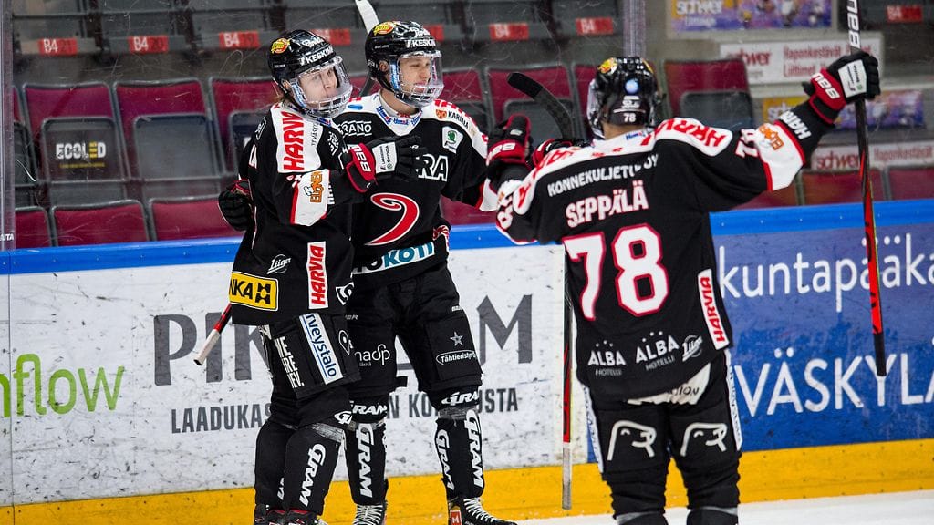 JYP karkasi tiistain taistelussa 1–0-johtoon, kun Samuel Valkeejärvi lapioi irtokiekon sisään. Aika 1.51.