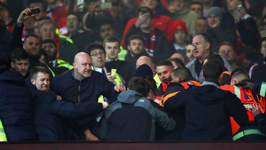 Katsomossa nujakka syntyi, kun muutama Liverpoolin kannattajat kävivät laittamassa joukkueensa lipun esille kotiyleisölle varattuun yläkatsomoon.