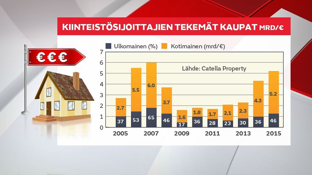 Suomalaisin kiinteistöihin sijoitettiin viime vuonna lähes ennätystahtiin – yli viidellä miljardilla eurolla. Ulkomaiset sijoittajat ovat palanneet Suomeen ja tekivät kaupoista lähes puolet.