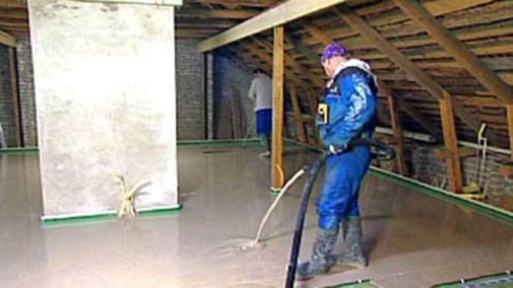 Omakotitalon ullakon lattiaan asennettiin vesikiertoinen lattialämmitys, jonka päälle valettiin kevyt ja nopeasti kuivuva kipsimassa.