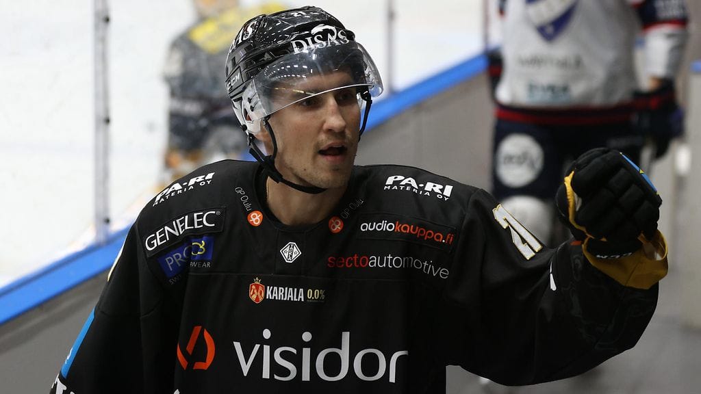 Kärpät-hyökkääjä Otto Karvinen taklasi itsensä suihkuun HIFK:ta vastaan pelatun ottelun päätöserässä.